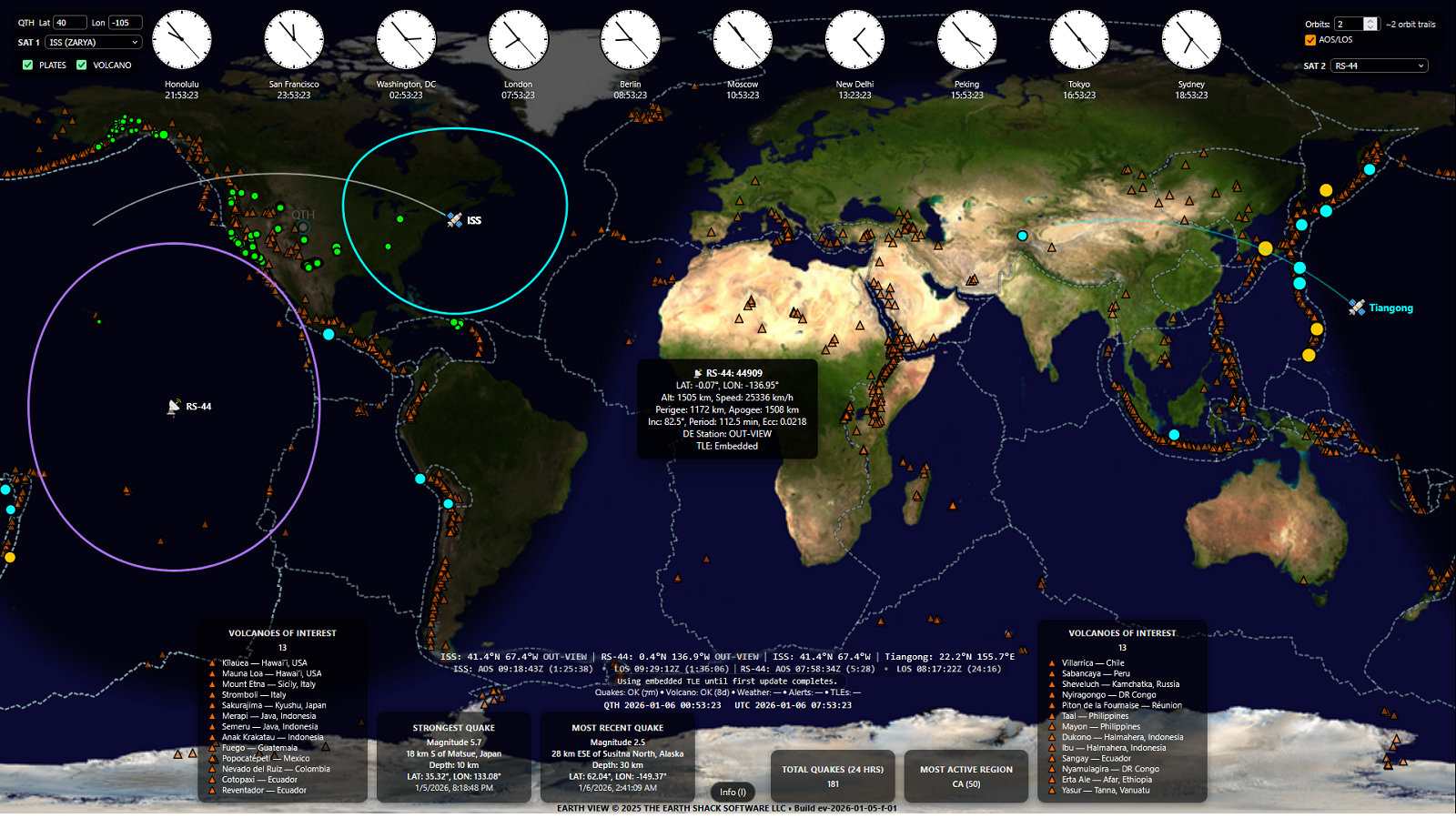 EarthView, our first product, unifies live hazard data, orbital tracking, position-based relevance (QTH), and day/night context into a single operational display. It shows what’s happening beneath your feet and what’s moving overhead with earthquakes, a curated list of USGS volcano markers, tectonic plate boundaries, footprint rings, visibility indicators, and optional AOS/LOS timing — without turning the interface into a heavyweight tracking suite.